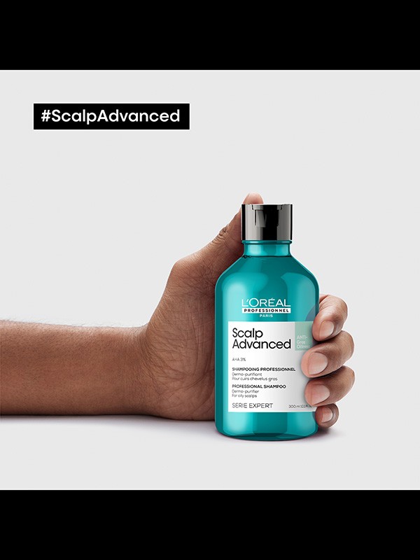 Șampon dermo-purificator pentru scalp gras Serie Expert Scalp Advanced de la L’Oréal Professionnel . Cu o concentrație de 3% AHA, acest șampon-gel cu consistență lejeră purifică scalpul și fibra capilară de reziduuri, transpirație și ulei pentru o senzație de prospețime.