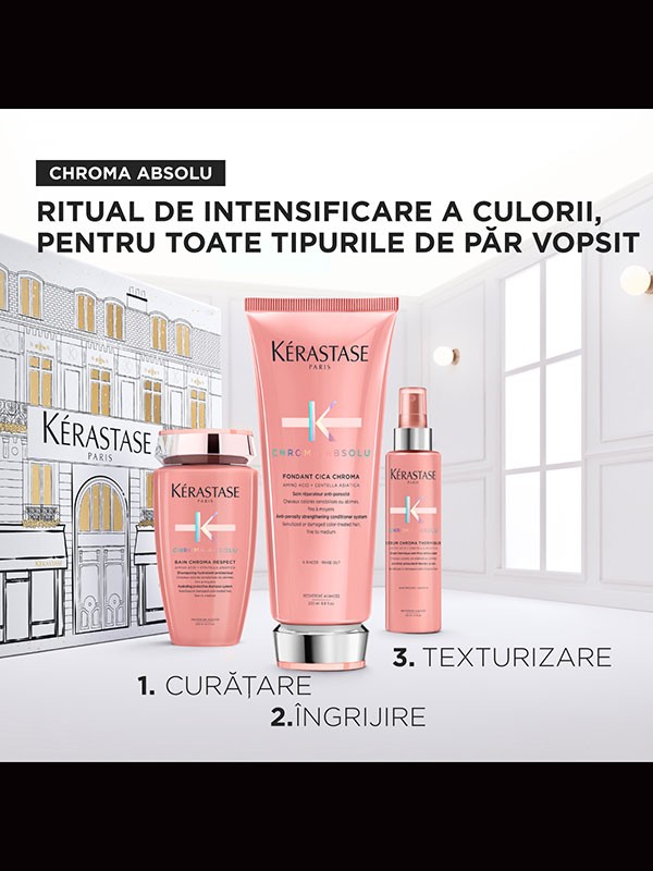 2. Fondant Cica Chroma – Aplicati pe parul spalat si tamponat cu prosopul, masand de la jumatatea lungimii pana la varfuri. Lasati sa actioneze 2-3 minute, apoi clatiti abundent.
