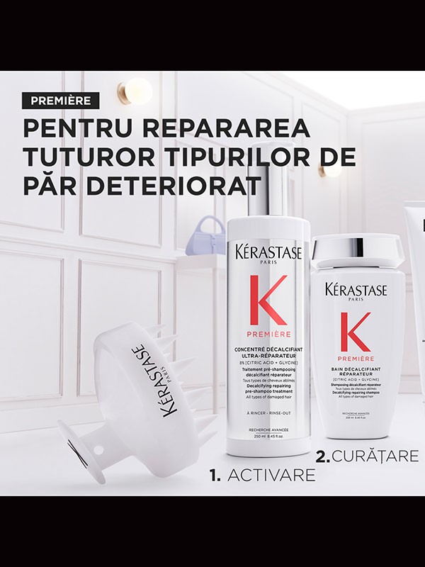 1. Concentre Decalcifiant Ultra-Reparateur – Aplicati pe parul umed, inainte de samponare, pe toata lungimea. Masati usor si lasati sa actioneze 5 minute. Nu clatiti.