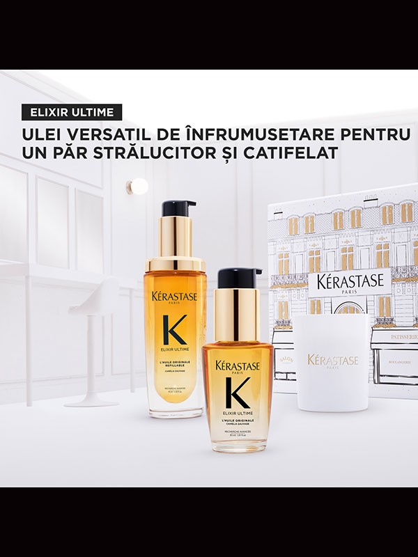 - Elixir Ultime L’Huile Originale 30 ml – format de calatorie ideal pentru ingrijirea parului oriunde, cu aceleasi beneficii de nutritie profunda si luciu radiant.