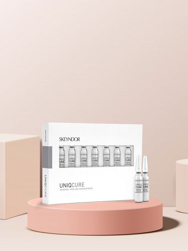 Renewal Peeling Concentrate de la Skeyndor este un tratament leave-in sub forma de fiole. Acest concentrat hidrateaza si ilumineaza pielea, fiind inspirat de peelingurile medical estetice. Formula sa cu 15% acizi ajuta la netezirea pielii cu pori mariti si cicatrici de acnee.